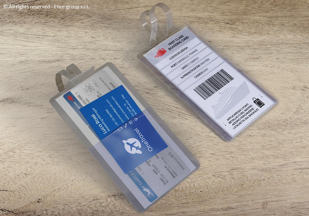 Volltransparenter Kofferanhänger für Kreuzfahrten mit personalisierter Werbekarte. Hergestellt aus zwei Schichten aus vollständig transparentem, widerstandsfähigem PVC mit zwei Taschen: eine zum Einstecken der Bordkarte und die andere für eine im Lieferumfang enthaltene Visitenkarte oder Karte. Die Karte ist auf einer Seite mit digitalem Farbdruck und auf der Rückseite mit nützlichen Reisetipps personalisiert.